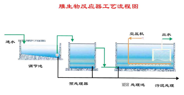膜生物反應器(MBR)工藝是膜分離技術與生物技術有機結合的新型廢水處理技術。它利用膜分離設備將生化反應池中的活性污泥和大分子有機物質截留住,省掉二沉池。活